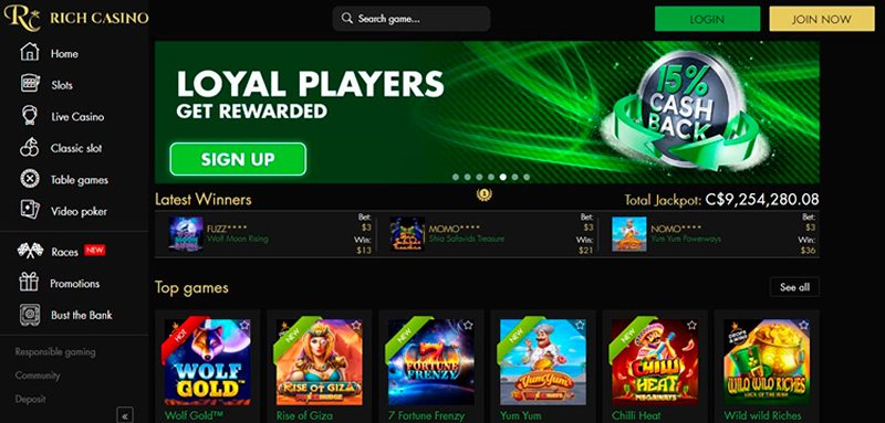 Сайт Rich Casino выглядит стильно и оформлен в темных тонах. Русского языка для интерфейса нет, площадка больше ориентирована на жителей Европы, может не открываться на территории некоторых стран СНГ. Названия компании – владельца внизу страницы нет, и иконка лицензии отсутствует. Слева наверху расположен логотип заведения, в центре той же строки – поле для поиска игры, а под названием на боковой панели можно увидеть рабочие вкладки: